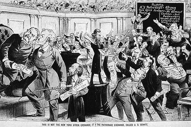 Cartoon, from Puck magazine, April 13, 1881. Arthur’s beginnings in politics were in New York, where in 1871 he was appointed collector of customs for the port of New York, a place conspicuous for flagrant abuses of the spoils system. Some people feared that as vice-president (the period of this cartoon), Arthur would have a pernicious influence on government. As president, however, he undertook reforms that removed patronage from the civil service.Library of Congress / LC-USZC4-6400