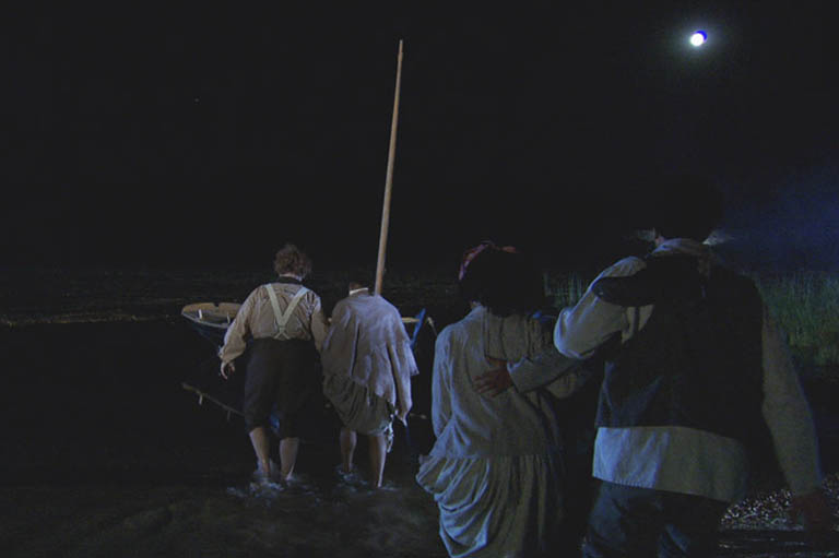 Scene from The Underground Railroad: Freedom seekers escaping by boat under the cover of darkness.90th Parallel Productions Ltd. -