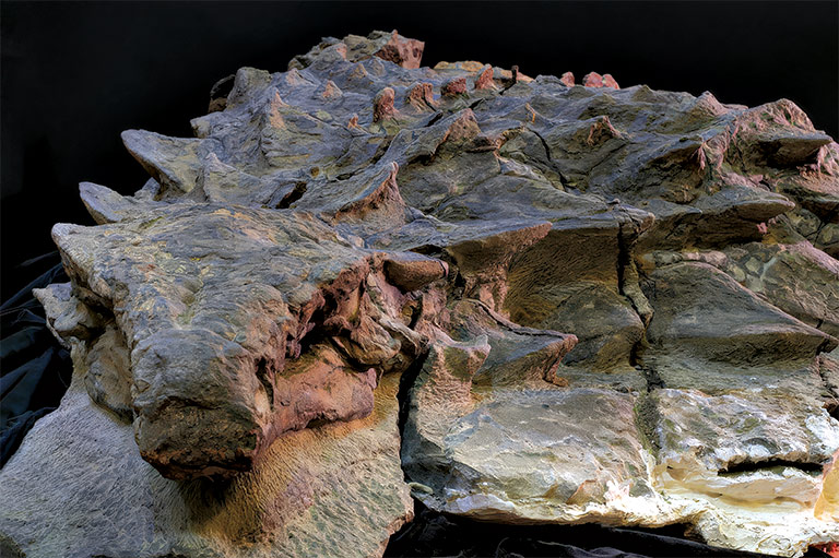 The trackways that led to Arbour’s discovery also show that nodosaurs, a related armoured species, coexisted with ankylosaurs at this time. Similar in size, nodosaurs had the same bony armour plating as ankylosaurs, though they had smaller triangular-shaped heads and fierce-looking spikes protruding from their shoulders. And there was no club on their flexible tails. A nodosaur on display at the Tyrrell museum is so astonishingly well preserved that it has become popularly known as “the dinosaur mummy.” “This is the closest you’ll ever get to being face to face with a dinosaur,” says Brown, noting that its effect on museum-goers can be profound.