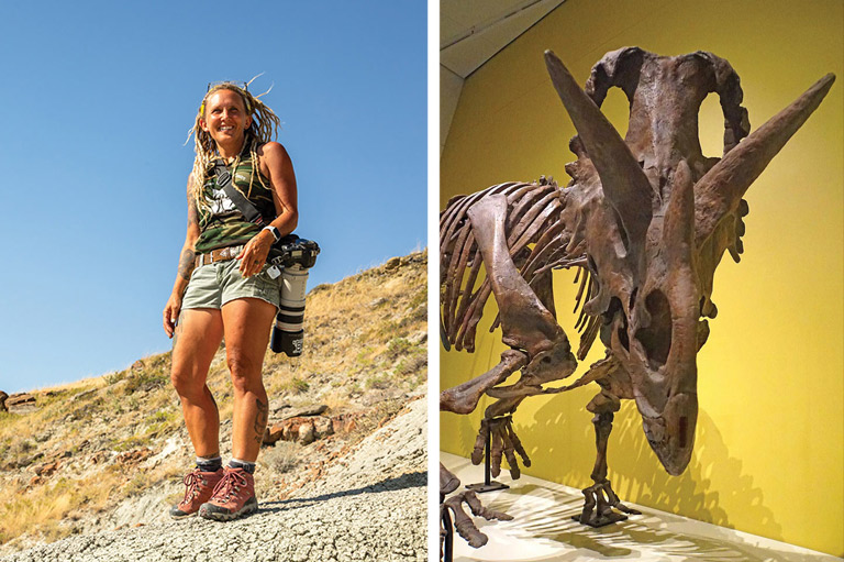 Another intrepid fossil hunter, Wendy Sloboda, is invoked in the name of the ceratopsian, Wendiceratops, that she discovered in 2010. David Evans of Toronto’s Royal Ontario Museum describes Sloboda as “one of the best dinosaur hunters in the world” and “basically a legend in Alberta.” As a teenager growing up in Warner in southern Alberta, she discovered fossilized eggshells in 1987, which led Philip Currie and other scientists to uncover nests of duck-billed hadrosaurs, some with preserved embryos inside the fossilized eggs. Since then, Sloboda has combed the dusty rocks of the Alberta badlands, as well as sites in Argentina, Mongolia, France and Greenland, and discovered more than 300 important specimens — many of them new species like the ceratopsian that bears her name. Research by David Evans and Michael Ryan of the Cleveland Museum of Natural History determined that Wendiceratops was a centrosaur that lived 79 million years ago and had an elaborate frill, particularly for an early ceratopsian. Today, the restored skeleton is on display at the Royal Ontario Museum — and an illustration of its head is now proudly tattooed on Wendy Sloboda’s arm.