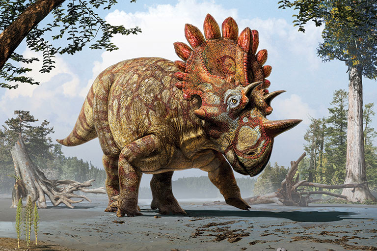Of the 40 ceratopsian species identified to date, more than half have been discovered in Alberta. They’re divided into two large groups: centrosaurs and chasmosaurs. Centrosaurs have longer horns on their noses, shorter horns on their brows and fewer showy frills, whereas chasmosaurs (like Chasmosaurus itself) have shorter nose horns, longer horns on their brows and more-extravagant frills. Centrosaurs died out about 71 million years ago, while chasmosaurs lasted until the mass extinction that ended the Cretaceous 66 million years ago.
