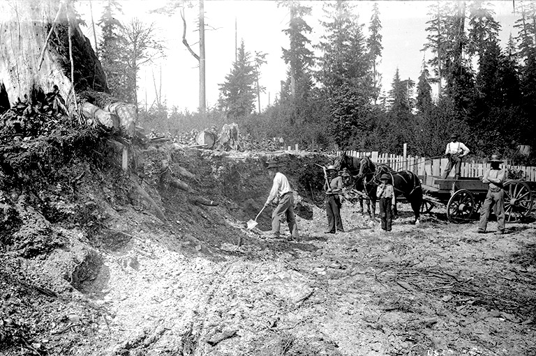 Workers clear a midden - a deposit of shells - to make way for a road through Stanley Park, 1888.City of Vancouver Archives -