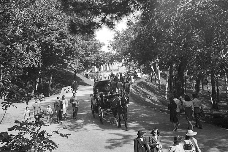 A calèche and pedestrians at Mount Royal Park, 1936.McCord Museum -