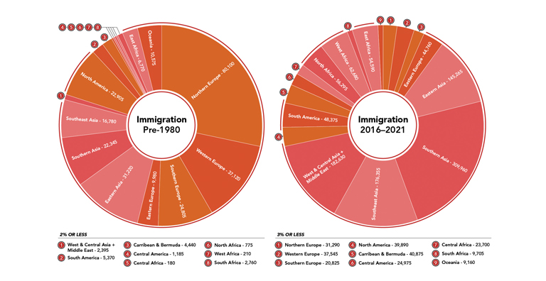 He attributes the shift in attitudes to the election, in the interim, of Moe Sihota, B.C.’s first South Asian member of the legislative assembly. Something else happened in those years; the Mulroney government more than doubled its annual immigration target, pushing it north of 250,000 newcomers a year, well above the Trudeau era. Overwhelmingly, these newest waves of immigrants settled in the suburbs around Toronto, Montreal, Vancouver, Calgary and Edmonton.