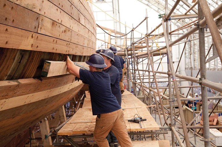The planks muscled into place to form the outer hull this time around are angelique from Suriname in South America. “They’re naturally resistant to rot and decay, very dense, very hard,” Hutchinson explained. The planks contain resins that repel marine organisms that bore into other woods.