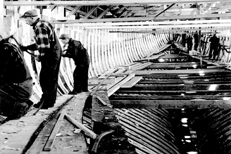 Men work on the inside of the hull of Bluenose II at Lunenburg, Nova Scotia, 1963.Nova Scotia Archives -
