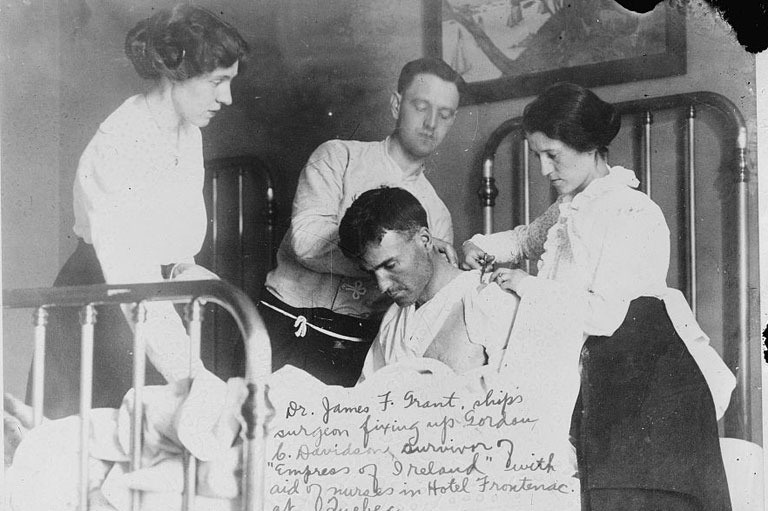 Injured survivor Gordon C. Davidson is attended to at Hotel Frontenac in Quebec City.Library of Congress -