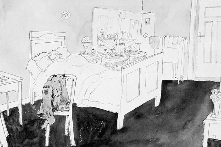 "Canadian Women's Corps Sleeping Quarters in the Administration Building, Oct 45, 1st Echelon, Bad Zwischenhan, Germany." Watercolour, ink, and graphite on paper.Canadian War Museum / Beaverbrook Collection / AN 1971 0261-6261 1588 CN 12044 -