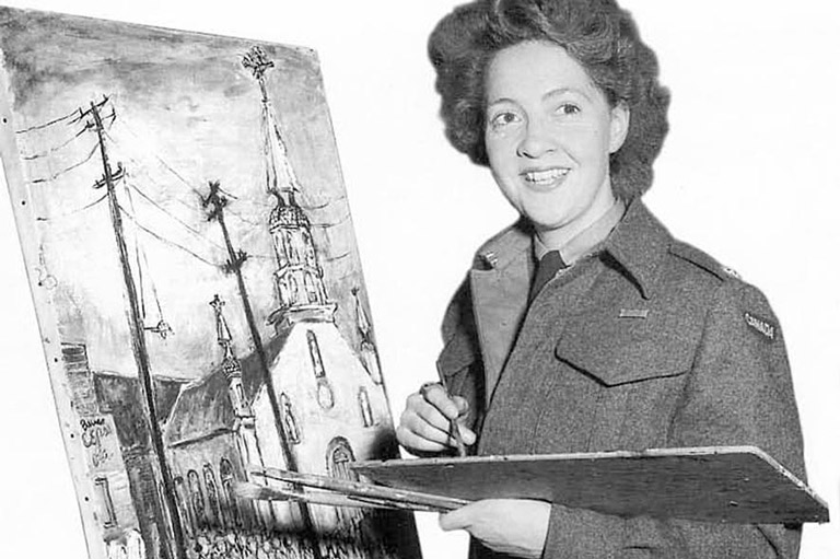 It was 1945 and hostilities were already winding down when Second Lieutenant Molly Lamb received her appointment to the Canadian Army Historical Section. In June she sailed for Europe, crossing paths with the troopships that were bringing soldiers home from the fighting. But Molly was happy. For a time it had seemed that the only Canadian woman to be officially appointed as a war artist during World War II might not make it overseas at all. Looking hack across the decades. Molly is today convinced that it was Group of Seven artist A.Y. Jackson who tipped the balance in her favour. “I was in the army three years before they made me a war artist,” she recalls. “I didn’t know how much those old colonels were against women war artists at the time.”