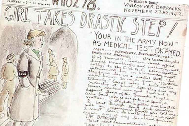 While waiting for the army to recognize her talents as an artist, Molly began a sketch diary entitled WI10278 (her regimental number). Describing the document many years later, fellow war artist Charles Comfort wrote, “I first saw this unique diary in its original form and was much impressed by its unorthodox format. The essence of the diary and the events, the humour and the reality it conveys bring us Molly's zest for life and her special way of looking at things.”