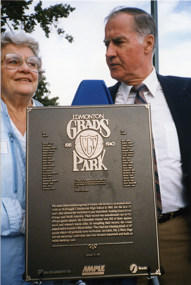 In 1950, the Edmonton Grads were voted Canada’s greatest basketball team of the first half century by sports editors and sportscasters in a Canadian Press poll. Inducted into several sports Halls of Fame, the team has received many additional honours; for instance, there’s a plaque by Parks Canada “commemorating the national historical significance” of the Grads at the entrance to Commonwealth Stadium in Edmonton. There’s also Edmonton Grads Park, located in the city’s Westmount area. In 2025, the Edmonton Transit Service ran a historical bus tour so patrons could learn about the players and the businesses who supported them and see where they lived and played in the city.